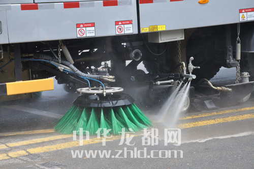 ????當(dāng)天上午,記者在市政府門前看到,由宇通汽車廠家提供試機(jī)的幾臺(tái)環(huán)衛(wèi)高壓清洗車和掃地車列成一排(上圖),一臺(tái)小型掃地車一邊行駛一邊清掃地面,前端幾個(gè)旋轉(zhuǎn)式毛刷(下圖)進(jìn)行清掃的同時(shí),還向地面噴灑出霧狀水,路面上的各類垃圾清掃后吸入后面的車斗里,駛過之處,路面干凈許多。隨后,大型環(huán)衛(wèi)清洗車“上陣”,車體四周分頂噴、中噴和后噴,四五十米寬的道路都能輕松噴射覆蓋。經(jīng)過清水“洗禮”后,兩旁慢車道上綠化帶的植被上積存的浮土被沖刷得一干二凈,綠意顯得更濃了。打開頂噴,清洗車向天空噴射出幾米高的幾股高壓水柱,有效降塵,凈化空氣。經(jīng)過兩輪試驗(yàn)下來,記者看到,瀝青馬路上變得干凈而清新,以往灰蒙蒙的馬路一下子變得“眉清目秀”。
