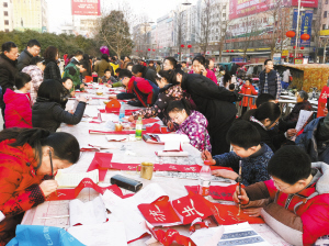 ????② 新春佳節(jié)即將來臨,三川大地處處洋溢著喜慶的氛圍。市區(qū)五一廣場,一群愛好書法的小朋友正在為市民義務(wù)寫春聯(lián)。(記者 侯俊豫 攝)