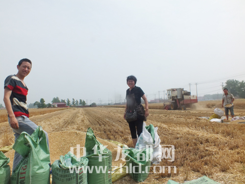 ??? 昨日,鄲城縣小麥?zhǔn)崭罾_序幕。圖為該縣城郊鄉(xiāng)小麥?zhǔn)崭瞵F(xiàn)場(chǎng)。(記者 盧好亮 通訊員 孫守功 攝)