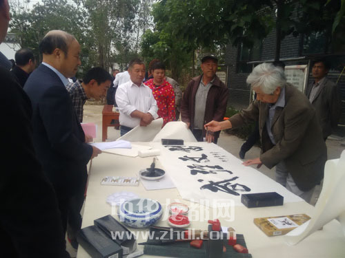 ????當(dāng)日在李寨文化廣場(chǎng)舉行的啟動(dòng)儀式上,46名省市書(shū)畫(huà)名家、志愿者同時(shí)亮相,主持人逐一介紹時(shí),現(xiàn)場(chǎng)村民就開(kāi)始摩拳擦掌,為求字求畫(huà)做準(zhǔn)備?;顒?dòng)開(kāi)始后,文化廣場(chǎng)上一字排開(kāi)的書(shū)畫(huà)案臺(tái)很快被村民圍滿(如圖)。國(guó)家一級(jí)美術(shù)師、中國(guó)美術(shù)家協(xié)會(huì)會(huì)員翟東奇,北京榮寶齋畫(huà)院特約畫(huà)家朱文華等大家的作品更是供不應(yīng)求。面對(duì)熱情的“粉絲”,書(shū)畫(huà)家們也被感染,揮毫潑墨一刻不停,送走最后一位村民,已是午后1時(shí)。