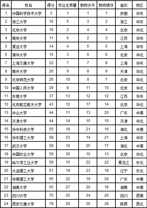 將滿足上述3項(xiàng)條件的大學(xué)的3項(xiàng)排名名次相加后升序排列,得分越低越好。得分相同,教師平均學(xué)術(shù)水平高的大學(xué)居前。