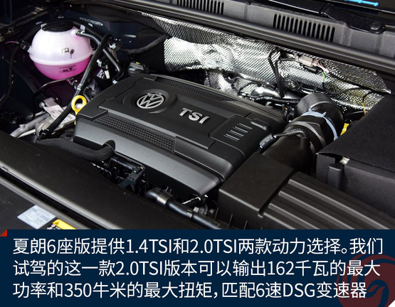 在動(dòng)力方面,夏朗6座版也和7座版保持一致,提供1.4TSI和2.0TSI兩款動(dòng)力選擇。我們?cè)囻{的這一款搭載第三代2.0T EA888發(fā)動(dòng)機(jī),可以輸出162千瓦的最大功率和350牛米的最大扭矩,并且匹配6速DSG雙離合變速器。