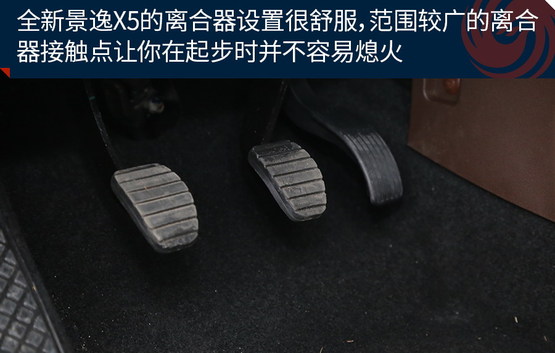 對(duì)于手動(dòng)擋車(chē)型而言,除了變速器本身外,還有一個(gè)部件十分重要那就是離合器,一個(gè)調(diào)整的十分舒適的離合器可以給駕駛者帶來(lái)更好的駕駛感受。全新景逸X5的離合器設(shè)置很舒服,雖然從腳感來(lái)說(shuō),它的離合器設(shè)定有些偏沉,但不要擔(dān)心,范圍較廣的離合器接觸點(diǎn)讓你在起步時(shí)并不容易熄火。