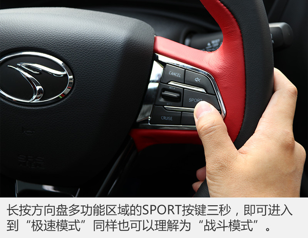 此次DX3 SRG在原有的運動模式外,還新增了“極速競技模式”同時開啟方法也很簡單,只需要長摁方向盤右側(cè)的SPORT按鍵三秒,這時儀表板會由白色背光變成紅色,表示已經(jīng)進(jìn)入該模式。