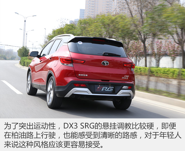東南DX3 SRG很明顯是為85后年輕群體打造的一款車,雖然它的最終用戶不一定是年輕人,但不可否認(rèn)東南DX3 SRG是同級中顏值頗高的一員,無論從哪個角度都足夠讓人驚艷;試駕活動中全新的動力組合非常出色,尤其是底盤調(diào)教給我留下了深刻的印象,這對于年輕消費者來說無疑是個利好的期待,作為10萬元級別SUV,DX3 SRG有很強(qiáng)的實力與競品爭奪市場。(圖/文 張嘉文)