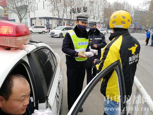 1月24日,在寒風(fēng)中執(zhí)勤的市公安局交通警察管理支隊(duì)直屬一大隊(duì)的交警收到美團(tuán)外賣送來的臘八粥。