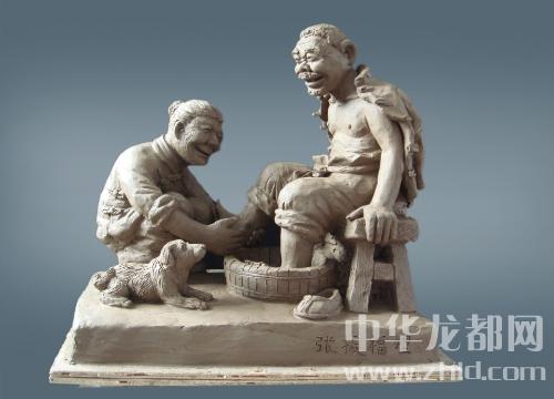《老來伴》作品長(zhǎng)50cm、寬35cm、高46cm。作品表現(xiàn)的是:老漢干了一天的農(nóng)活兒回到家里,老婆用溫水給老漢洗洗腳,消除一天的疲勞,表達(dá)了老夫老妻恩恩愛愛、相濡以沫、白頭偕老。
