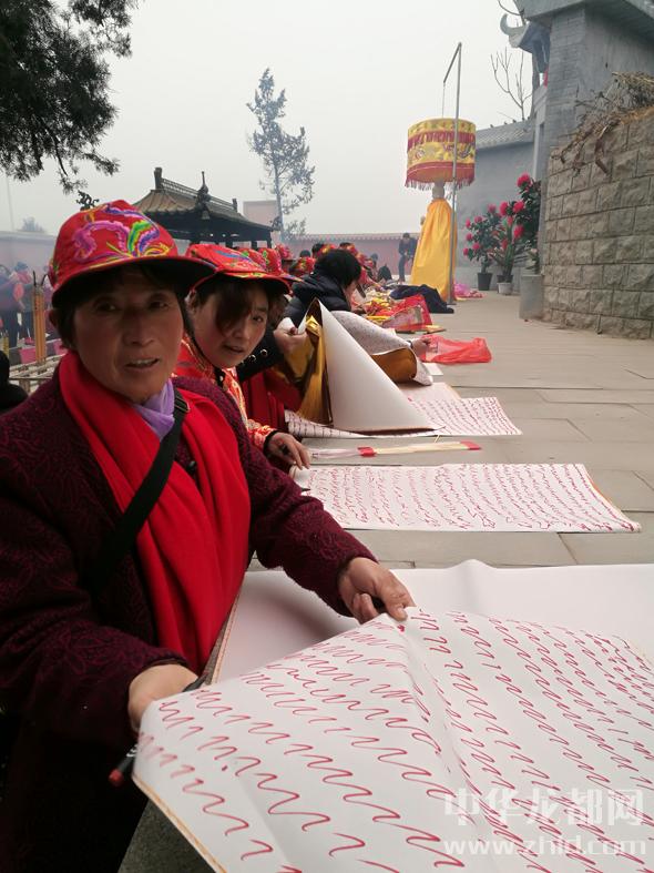大霧的確延緩了香客的腳步,這也讓晚來的記者得以看到祭拜的盛景。女媧陵前,十幾名身著統(tǒng)一緞面紅襖,穿黑棉布鞋的女客正在結(jié)伴焚香祭拜,口音明顯和當?shù)厝瞬煌?。她們是從距西華300多公里的濮陽范縣、臺前縣來的,說是凌晨2時就起身出發(fā),大霧中不僅遭遇堵車,還迷了路,到女媧城都快8時了。她們這次一起來的有30多人,分乘4輛車。就像往常前來一樣,她們在女媧城要焚香、跪拜、“寫賬”(在紙上畫符,敬奉女媧的一種民間形式)、“守功”(在大殿靜坐,以示對女媧親近),直至下午方回。“我們每年六月初一和臘月初一都來,為啥?信奉女媧娘娘唄,不來不舒服?!逼渲幸晃豢仔障憧透嬖V記者。