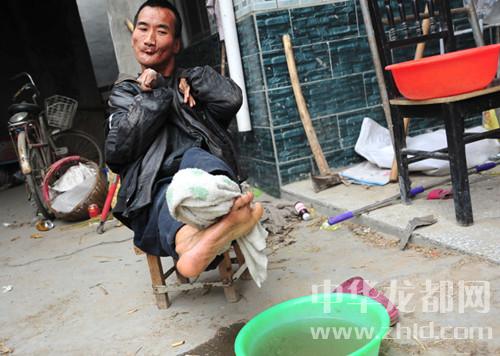 “這孩子40多年來,沒住過院,沒打過針,頭疼發(fā)燒會(huì)給媽媽示意,拿幾片藥一吃就好,這孩子命硬,一冬天也不洗回澡,到夏天爸爸媽媽幫他洗洗,有時(shí)候衣服一月才換一次。”鄰居張大媽說道?,F(xiàn)在紅印可以靈活的用雙腳幫媽媽做一些事情了。