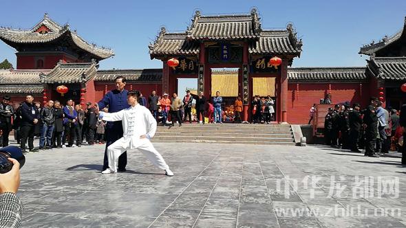 研討會前,王西安大師率弟子在淮陽太昊陵廟太極門前向海內(nèi)外太極拳愛好者傳授拳術(shù)。
