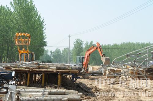 中華龍都網訊(周口報業(yè)全媒體記者 張勁松 通訊員 蘇千 文/圖)4月18日,東新區(qū)城管中心在該區(qū)國土局、許灣鄉(xiāng)政府的配合下,出動執(zhí)法人員120多名,執(zhí)法車輛10輛,對許灣鄉(xiāng)程寺行政村6處違法占地、違章建設進行強制拆除。