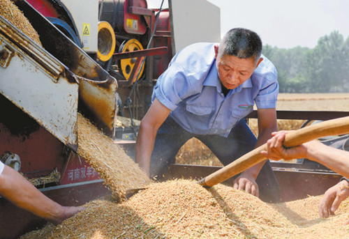 樊軍亭在裝運收獲的小麥