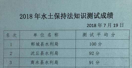 7月20日,一份周口市“2018水土保持法知識測試成績單”傳到鄲城縣水利局,該局以100分的優(yōu)異成績榮獲全市第一名。