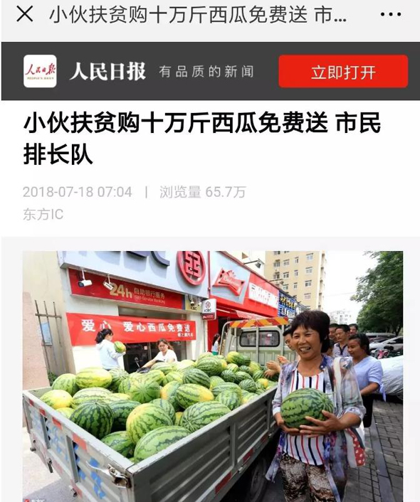 7月18日,《人民日?qǐng)?bào)》客戶端播發(fā)了“小伙購(gòu)十萬(wàn)斤西瓜免費(fèi)送 市民排長(zhǎng)隊(duì)”的一條新聞,瞬間刷屏朋友圈,一天閱讀量就突破100萬(wàn)人次,加上騰訊新聞、人民圖片截至19日發(fā)稿時(shí)閱讀量已達(dá)一百五十萬(wàn)人次,評(píng)論13000多條,人們都在稱贊咱扶溝小伙宋鐵托的善舉,被網(wǎng)友稱他為“愛心西瓜哥”。