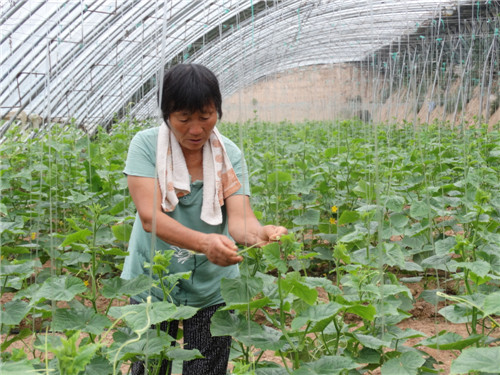 近年來,沈丘縣周營鎮(zhèn)大力發(fā)展藥材種植和特色瓜果蔬菜種植,既解決了貧困戶的就業(yè)問題,又促進(jìn)了當(dāng)?shù)剞r(nóng)業(yè)生產(chǎn)。圖為7月24日,貧困群眾孫素英在蔬菜種植基地管理吊籐晚秋小黃瓜。 記者 韋偉 通訊員 謝辛凌 攝