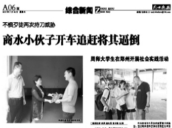 對于周口晚報的讀者朋友來說,熱心小伙陳亞輝并不算陌生——去年7月,陳亞輝曾駕駛自己的車輛逼停一位飛車搶奪項鏈的歹徒(2017年7月26日周口晚報圖文并茂報道),商水縣民政局局長朱赫受縣領導委托,到譚莊鎮(zhèn)慰問并看望陳亞輝,后來陳亞輝被商水縣委、縣政府評為“見義勇為道德模范”。