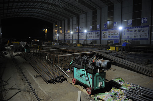 當(dāng)晚21時(shí)許,記者在泰和家園施工現(xiàn)場(chǎng)看到,鋼筋加工棚的工人們正在進(jìn)行鋼筋的切割,他們?cè)跒槊魈焓┕?zhǔn)備鋼筋材料。A1#樓正在進(jìn)行墊層的澆筑工作,A8#樓正在進(jìn)行負(fù)一層及周邊地庫的鋼筋綁扎及模板加固工作,A9#樓正在進(jìn)行負(fù)一層墻柱鋼筋及模板內(nèi)架搭設(shè)工作。現(xiàn)場(chǎng)2臺(tái)鋼筋切割機(jī)在不停地運(yùn)轉(zhuǎn),9臺(tái)塔吊在持續(xù)工作,40余名施工人員在場(chǎng)地內(nèi)各司其職,緊張而有序地趕進(jìn)度,整個(gè)施工現(xiàn)場(chǎng)如火如荼。