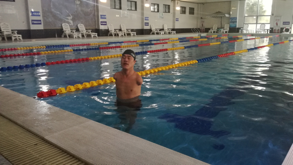 本報訊 10月16日上午,市體育中心游泳館一訓練池內(nèi),一名運動員正用不同尋常的泳姿在賽道內(nèi)訓練。只見他雙腳奮力踏水,努力保持身體平衡,到達終點時,這名運動員不是用手觸壁,而是用頭部觸壁。當他站起身時,人們才發(fā)現(xiàn)他是一名失去雙臂的殘疾運動員。他就是我市備戰(zhàn)省第七屆殘運會的運動員島建書。