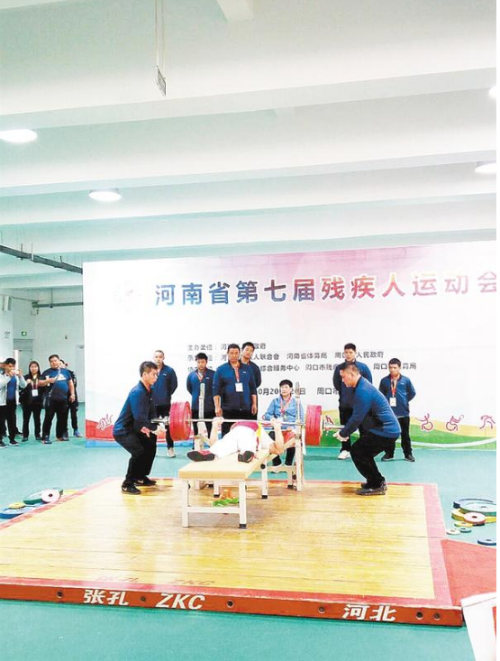 10月24日下午,在河南省第七屆殘疾人運(yùn)動(dòng)會(huì)男子舉重65公斤級(jí)比賽中,南陽選手范天增以185公斤的成績(jī)強(qiáng)勢(shì)奪冠,遠(yuǎn)高于第二名信陽選手湯孝虎95公斤的成績(jī)。②8記者 張志新 攝