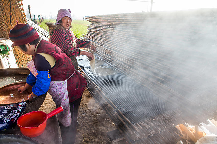 寒冬,河南省沈丘縣付井鎮(zhèn)楊莊村子里,一個(gè)個(gè)制作粉皮的工棚里爐火正旺,熱氣騰騰的大鍋里漂出一張張粉皮。田野中,到處是晾曬粉皮的場(chǎng)景,真是難得一見(jiàn)。