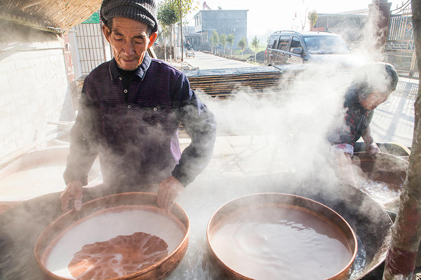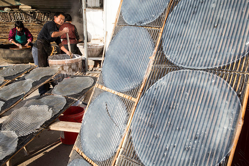 該村地處豫皖兩省交界處,是一個(gè)聞名遐邇的粉皮加工專(zhuān)業(yè)村。村里人手工做粉皮已有近百年歷史,從事粉皮加工的村民達(dá)500多人。 來(lái)到這里,您可以看到手工做粉皮的全過(guò)程。(王天定文/圖)