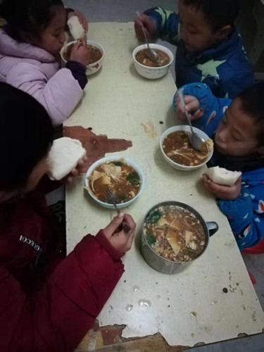 “校長(zhǎng)做的飯好吃嗎?”“好吃!”五個(gè)孩子異口同聲的回答,孩子們的眼神中只有幸福。
