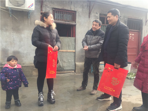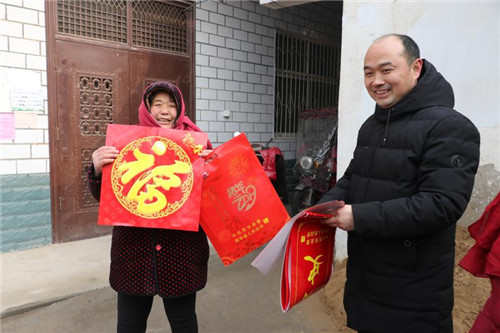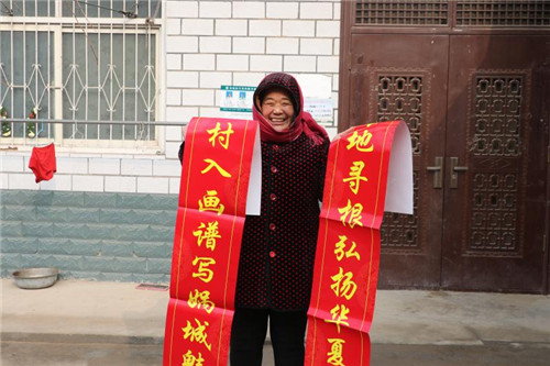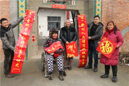 1月16日,西華縣艾崗鄉(xiāng)鐵爐村村民馬永清接過該縣縣委宣傳部駐村扶貧干部送來的春聯(lián)喜上眉梢。據(jù)了解,今年春節(jié)前夕,該縣財政投入200余萬元購置80萬副春聯(lián)在全縣鄉(xiāng)村范圍內(nèi)廣泛開展贈春聯(lián)、送祝?;顒?。