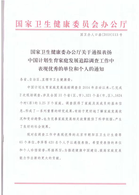通知顯示,中國(guó)計(jì)劃生育家庭發(fā)展追蹤調(diào)查自2014年啟動(dòng)以來(lái),已完成2次現(xiàn)場(chǎng)調(diào)查,涉及全國(guó)31個(gè)?。▍^(qū)、市)、321個(gè)縣(市、區(qū))、1624個(gè)村(居)的3.25萬(wàn)個(gè)家庭。調(diào)查獲得了家庭及其成員的基本信息,形成了一系列重要的研究成果,有助于更好地了解家庭發(fā)展?fàn)顩r和變動(dòng)趨勢(shì),也為完善家庭發(fā)展相關(guān)政策提供了科學(xué)依據(jù),產(chǎn)生了良好的社會(huì)效果。國(guó)家衛(wèi)健委對(duì)在此項(xiàng)工作中表現(xiàn)優(yōu)秀的65個(gè)單位、420名個(gè)人進(jìn)行通報(bào)表?yè)P(yáng),希望受表?yè)P(yáng)的單位和個(gè)人珍惜榮譽(yù),再接再厲,為推進(jìn)健康中國(guó)建設(shè)、提高家庭發(fā)展能力作出新的更大的貢獻(xiàn)。