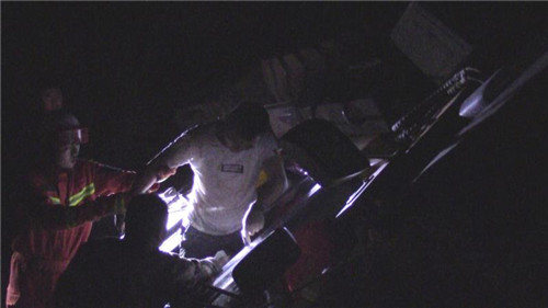 當(dāng)夜,消防指戰(zhàn)員接到調(diào)派命令后迅速趕往事故現(xiàn)場。指揮員觀察了解得知,側(cè)翻的是一輛重型推土車,由于作業(yè)區(qū)地面不平,司機在倒車時車輛發(fā)生側(cè)翻,欲打開車門跳車未果,左臂反而被車輛駕駛室一側(cè)死死壓在地面上,無法動彈。當(dāng)時工地上沒有同事,周邊也沒有行人,呼救無應(yīng)后,司機忍著巨烈疼痛摸到手機電話求救。