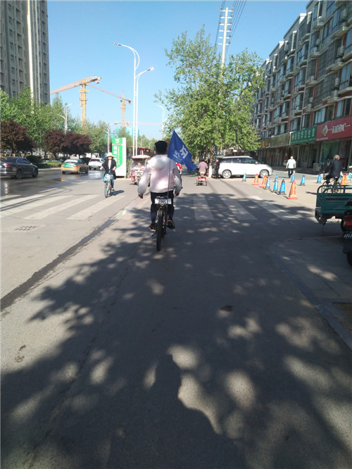 4月18日上午,一位市民在周口中心城區(qū)慶豐路的人行道上秀起了車技,在車多人多的路段玩起“大撒把”,看起來很危險。記者 吳繼峰 攝