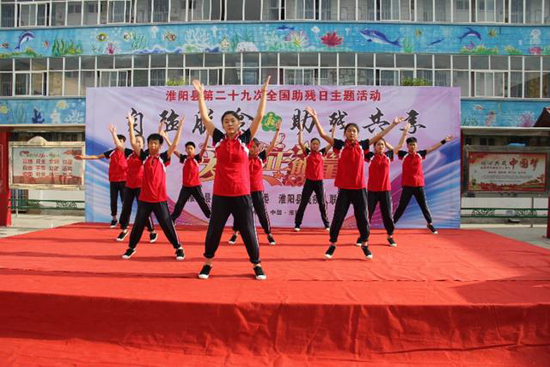 活動儀式上,縣特殊教育學(xué)校學(xué)生和縣音樂家協(xié)會文藝志愿者分別為觀眾表演了精彩的文藝節(jié)目??h特殊教育學(xué)校的學(xué)生首先表演了舞蹈《海草舞》,文藝志愿者周紅春演唱了歌曲《愛的奉獻(xiàn)》、《天南地北淮陽人》、李泉稼小朋友演唱了豫劇《洼洼地里好莊稼》,淮陽特殊教育學(xué)校學(xué)生表演了節(jié)目《感恩的心》。精彩的表演贏得了現(xiàn)場觀眾的陣陣掌聲。