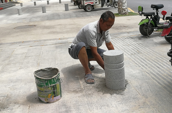 7月9日上午,工人正在八一大道兩側(cè)的人行道上安裝隔離石樁。為杜絕機(jī)動(dòng)車占用人行道,相關(guān)部門近日陸續(xù)在中心城區(qū)多條主干道兩側(cè)的人行道上安裝隔離石樁。市民紛紛表示,安裝隔離石樁讓人行道更通暢了,也使城市更有序了。 記者 關(guān)秋麗 攝