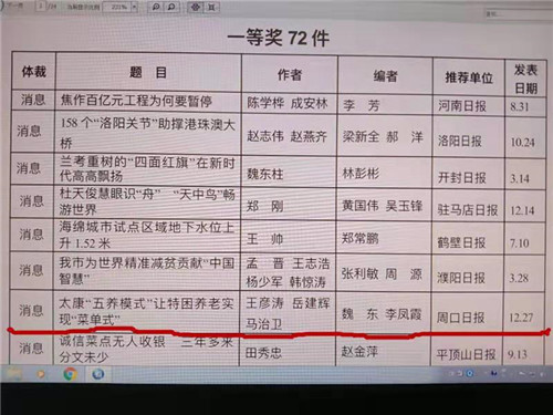 河南新聞獎(jiǎng)是經(jīng)省委、省政府批準(zhǔn)常設(shè)的省級(jí)考核評(píng)比表彰項(xiàng)目,由河南省新聞工作者協(xié)會(huì)組織,是我省新聞界的最高獎(jiǎng)項(xiàng)。每年一次的評(píng)選活動(dòng)是對(duì)全省新聞宣傳工作成果的全面檢閱。今年在第三十六屆(2018年度)河南新聞獎(jiǎng)評(píng)選中,全省50余家有新聞資質(zhì)的新聞媒體參評(píng),最終共有343件作品獲獎(jiǎng)。其中:特別獎(jiǎng)2件、一等獎(jiǎng)72件、二等獎(jiǎng)106件、三等獎(jiǎng)159件、名專欄4件。周口日?qǐng)?bào)在此屆河南新聞獎(jiǎng)評(píng)選中,共有11件作品獲獎(jiǎng),其中一等獎(jiǎng)1件,二等獎(jiǎng)3件、三等獎(jiǎng)5件;另外2件作品獲得河南新聞獎(jiǎng)新聞?wù)撐莫?jiǎng)。