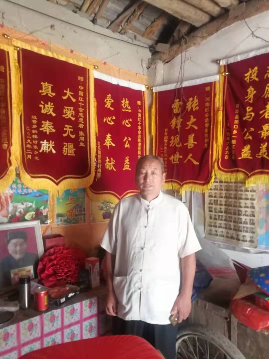 張同生今年65歲,發(fā)揚雷鋒精神,處處奉獻愛心,自愿參加河南省紅十字會志愿者,建立救病扶困基金,為困難病人墊付醫(yī)療費,幫助病人聯(lián)系醫(yī)院、專家教授治病,辦理住院手續(xù),為病人干的好事實事,就像秋后熟透的葡萄—一串一串的。病人為他送的錦旗掛滿了3間堂屋,病人為他送的表揚信少說也有半尺厚。