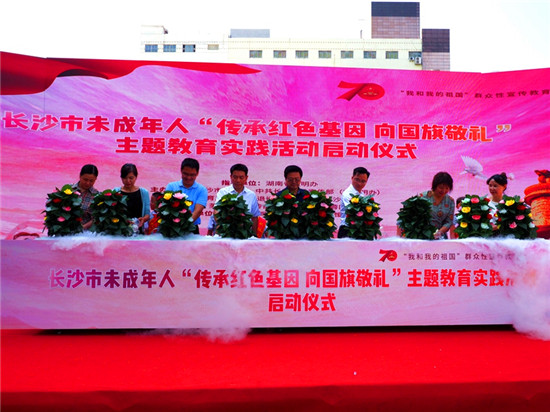 嘉賓們共同澆灌希望之花,啟動長沙市未成年人“傳承紅色基因 向國旗敬禮”主題教育實(shí)踐活動。
