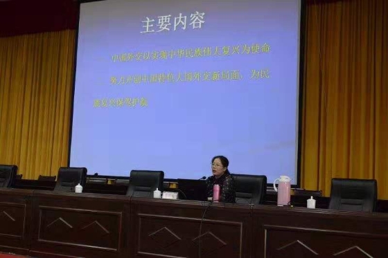 姚巧華從“新時(shí)代中國(guó)外交堅(jiān)持以實(shí)現(xiàn)中華民族偉大復(fù)興為使命”“努力開創(chuàng)中國(guó)特色大國(guó)外交新局面,為民族復(fù)興保駕護(hù)航”兩個(gè)大方面,深刻闡述了“習(xí)近平新時(shí)代中國(guó)特色社會(huì)主義外交思想”。所講觀點(diǎn)鮮明,重點(diǎn)突出,講法靈活,圖文并茂,事例貼切,語(yǔ)言精準(zhǔn),理論性強(qiáng),具有很強(qiáng)的指導(dǎo)性。