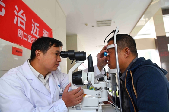 11月8日是記者節(jié)。為了讓奔波在新聞戰(zhàn)線,熬夜趕稿、組版的編輯記者眼睛更健康,11月5日,周口愛爾眼科醫(yī)院的醫(yī)生將儀器搬到周口報(bào)業(yè)傳媒集團(tuán),現(xiàn)場為編輯記者檢查眼睛,關(guān)愛新聞工作者的身心健康。圖為眼科醫(yī)生為記者檢查視力、實(shí)施治療。記者 劉俊濤 梁照曾 攝