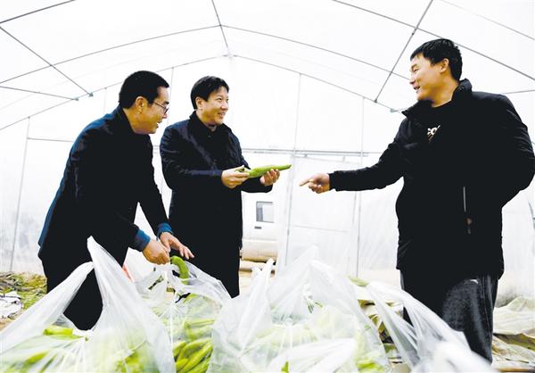 近日,周口報(bào)業(yè)傳媒集團(tuán)幫扶村——淮陽(yáng)縣馮塘鄉(xiāng)劉莊村的扶貧蔬菜大棚最后一棚辣椒采摘上市。據(jù)了解,這里產(chǎn)的辣椒個(gè)頭大、口感好,很暢銷(xiāo)。圖為周口報(bào)業(yè)傳媒集團(tuán)黨委副書(shū)記、總編輯、周口日?qǐng)?bào)社總編輯顧玉杰(中)向種植戶了解辣椒銷(xiāo)售情況。 記者 梁照曾 攝