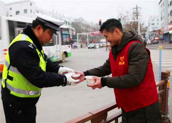 凌晨4時(shí),志愿者便來到縣城南關(guān)愛心粥屋熬粥、炒菜,50多名志愿者6時(shí)便趕來拉著大桶的熱粥分赴老君臺(tái)、大隅首、北關(guān)另外三個(gè)志愿服務(wù)點(diǎn),向環(huán)衛(wèi)工人、交警、工地務(wù)工人員派迭香甜的臘八粥。