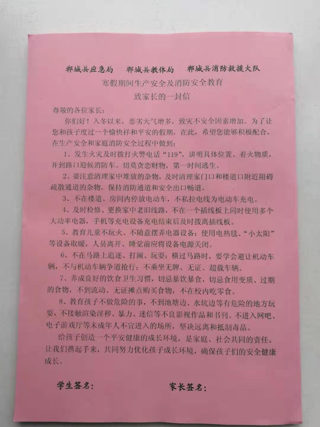 1月13日,寒假即將到來。鄲城縣為進(jìn)一步加強(qiáng)春節(jié)期間的安全生產(chǎn)和消防安全工作,鄲城縣印制30萬份《寒假期間生產(chǎn)安全和消防安全教育致家長(zhǎng)的一封信》,發(fā)放到全縣近30萬名中小學(xué)生手中,希望通過“小手拉大手”的形式,廣泛傳播生產(chǎn)安全和消防安全知識(shí),確保全縣廣大人民群眾度過一個(gè)安全祥和的春節(jié)。