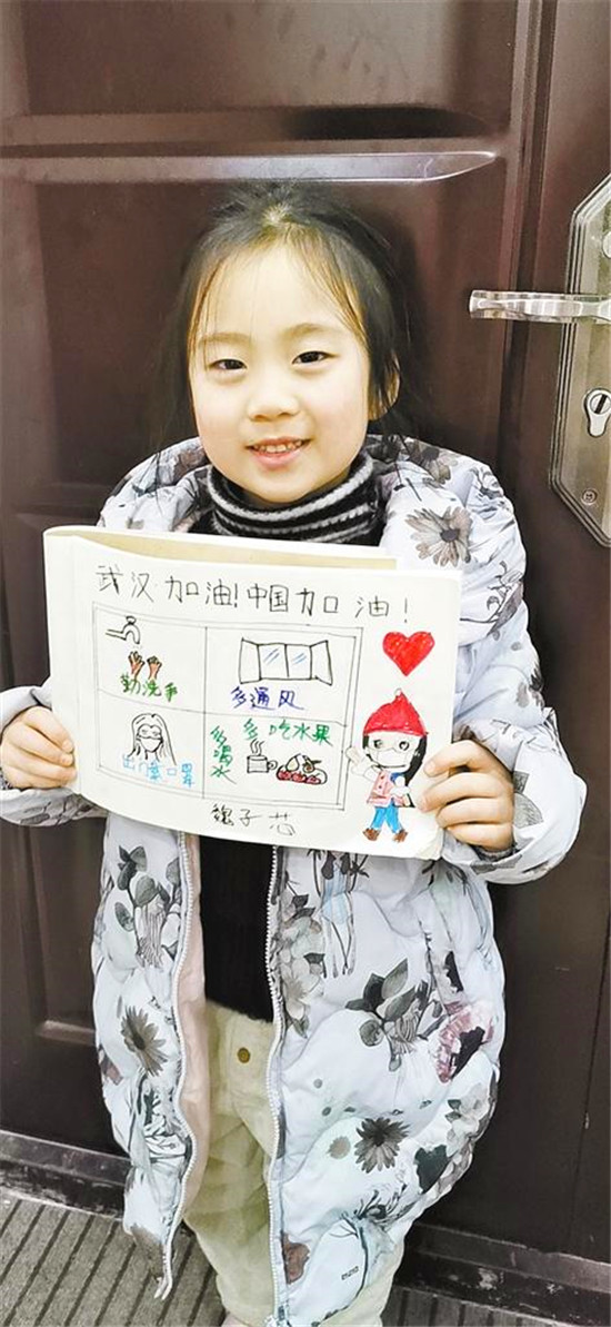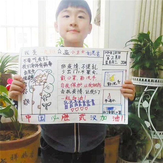 周口六一路小學近日布置了一項作業(yè),要求學生設計一張防疫宣傳小報,為武漢加油。該校學生用漫畫的形式呼吁大家勤洗手、戴口罩、多喝水、多通風。記者 王晨 通訊員 李琨 攝