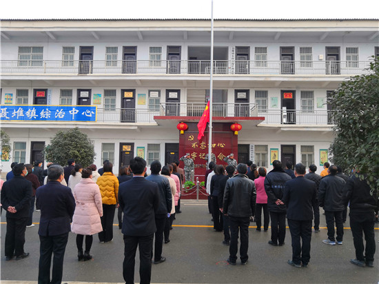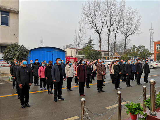按照疫情防控復(fù)產(chǎn)復(fù)工工作安排,2月24日為恢復(fù)上班的第一天。8時許,西華縣聶堆鎮(zhèn)政府全體干部衣冠莊重、佩戴口罩、按照間隔1.5米的距離整齊地站在國旗臺前共同舉行隆重的升國旗儀式,以一種不一樣的方式打開新的工作局面。