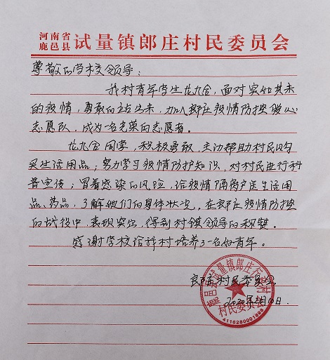 “龍九合同學積極勇敢,主動幫村民購買生活用品,努力學習疫情防護知識,對村民進行科普宣傳,冒著感染的風險給疫情隔離戶送生活用品、藥品,在我村疫情防控的戰(zhàn)役中表現(xiàn)突出,得到村鎮(zhèn)領(lǐng)導的稱贊,感謝學校給我們培養(yǎng)了一名好青年……”這是一封要寄往周口師范學院的感謝信,落款為鹿邑縣試量鎮(zhèn)郎莊行政村村民委員會。