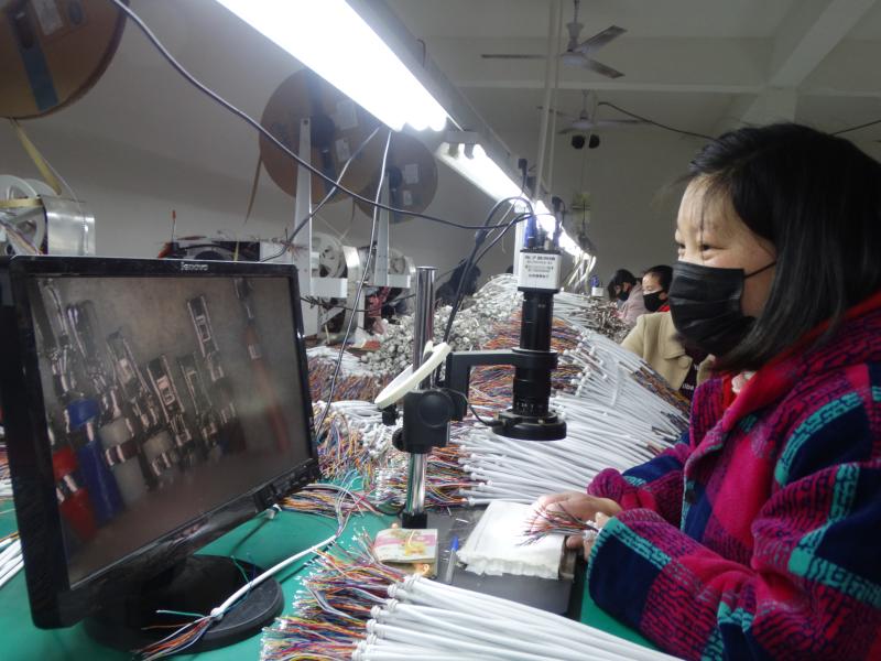 近日,沈丘縣周營(yíng)鎮(zhèn)眾邦電子來(lái)料組裝扶貧車(chē)間內(nèi),當(dāng)?shù)卮迕裼秒娔X檢驗(yàn)細(xì)微端子產(chǎn)品質(zhì)量。
