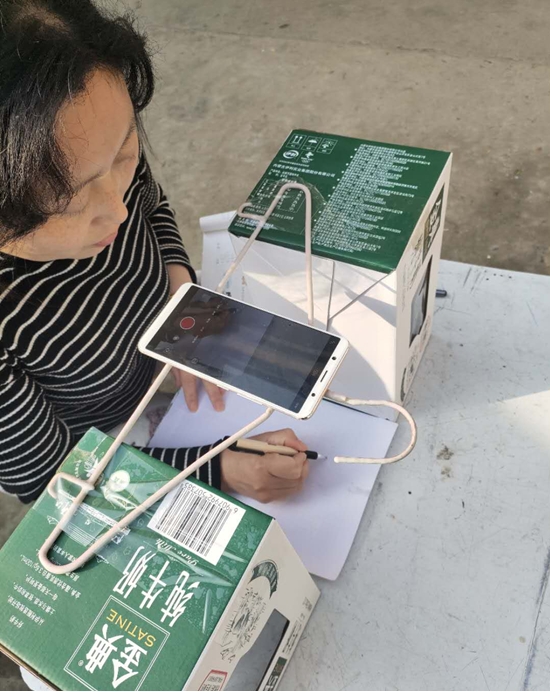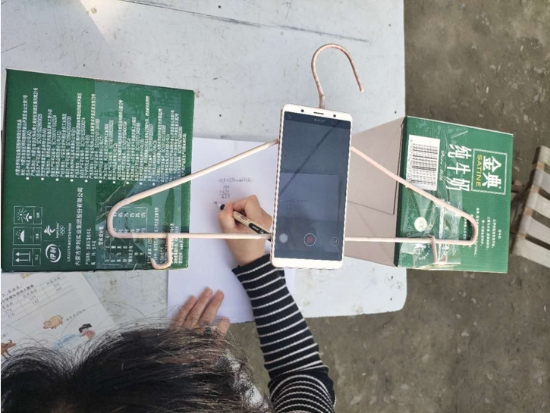 在備課時,朱霞很快遇到了難題:手機沒法固定,街上手機店又全部停業(yè),網上買的手機固定夾發(fā)不了貨。為了不耽誤學生上課,她想到用晾衣?lián)?、牛奶箱做成簡易支架,組裝后居然效果不錯。就這樣,一個晾衣?lián)?、兩個牛奶箱和一部手機組成了她的“三尺講臺”。
