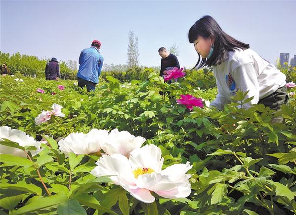 圖二 4月7日,在周口經(jīng)濟開發(fā)區(qū)淮河路辦事處小牛莊的一個花圃內(nèi),千余株牡丹相繼吐蕊,吸引不少市民前來賞花。近年來,我市不斷對中心城區(qū)進行改建,著力提升城市的園林綠化水平,切實激發(fā)了城區(qū)周邊農(nóng)民種植花卉、草木的熱情。 記者 孫安平 攝