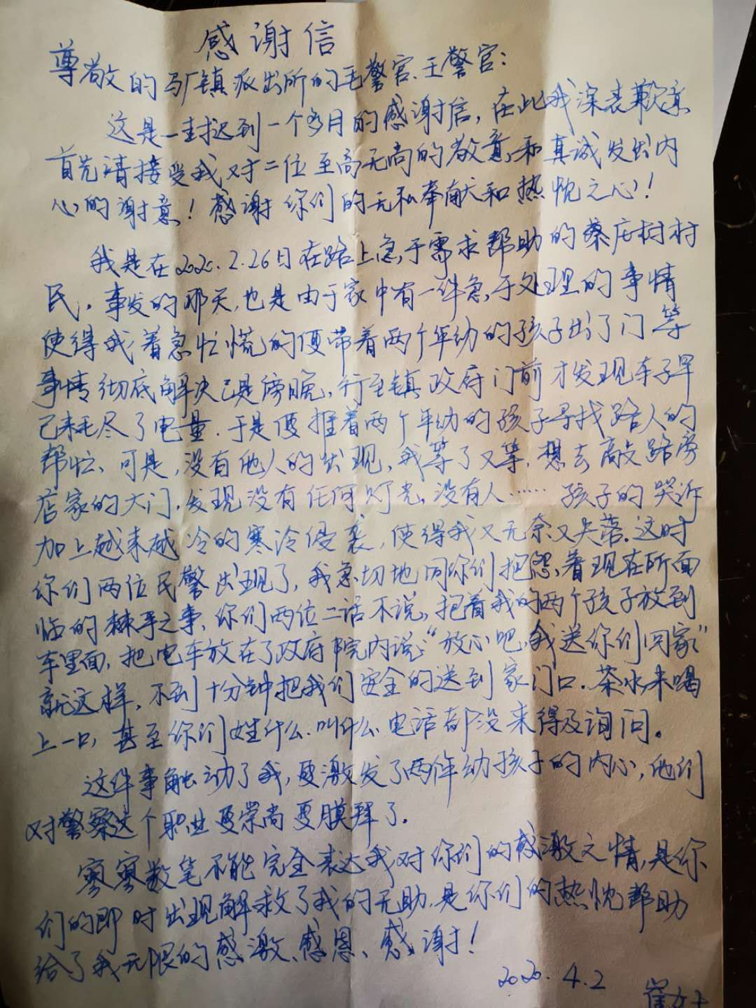 今年2月26日晚9時(shí)許,太康縣馬廠派出所民警劉華偉和輔警王以鶴、毛明陽例行每天夜間治安巡邏,巡邏到馬廠鎮(zhèn)黃莊行政村時(shí),遇到一女士帶著一個(gè)5歲和一個(gè)7歲的小朋友。該女士哭著說急需去馬廠衛(wèi)生院給5歲的小孩看病,可走到半路電動車沒電了。民警們立即把求助人的電動車就近停放妥當(dāng),把兩名小朋友抱上警車,駕駛警車趕往馬廠衛(wèi)生院。到達(dá)后又聯(lián)系急診醫(yī)生診斷并拿好藥物。