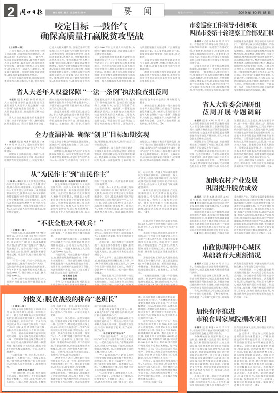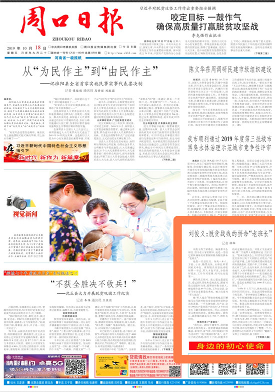 2019年10月18日,《周口日?qǐng)?bào)》頭版轉(zhuǎn)版,以《劉俊義:脫貧戰(zhàn)線的拼命“老班長”》