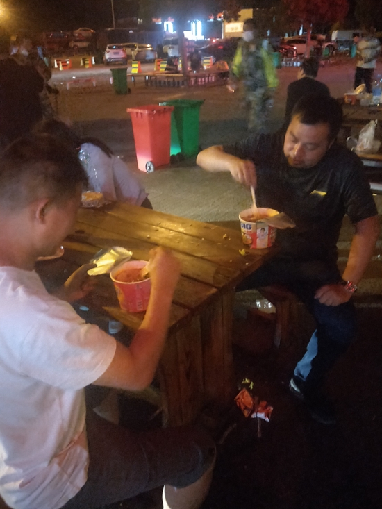 當晚,隊員們帶著嫌疑人歸來,在服務區(qū)內,群里傳來一張大家吃方便面的照片,靳偉成還發(fā)來一句:“帶了這么多衣服,忙得都沒有時間換一件?!?/p>