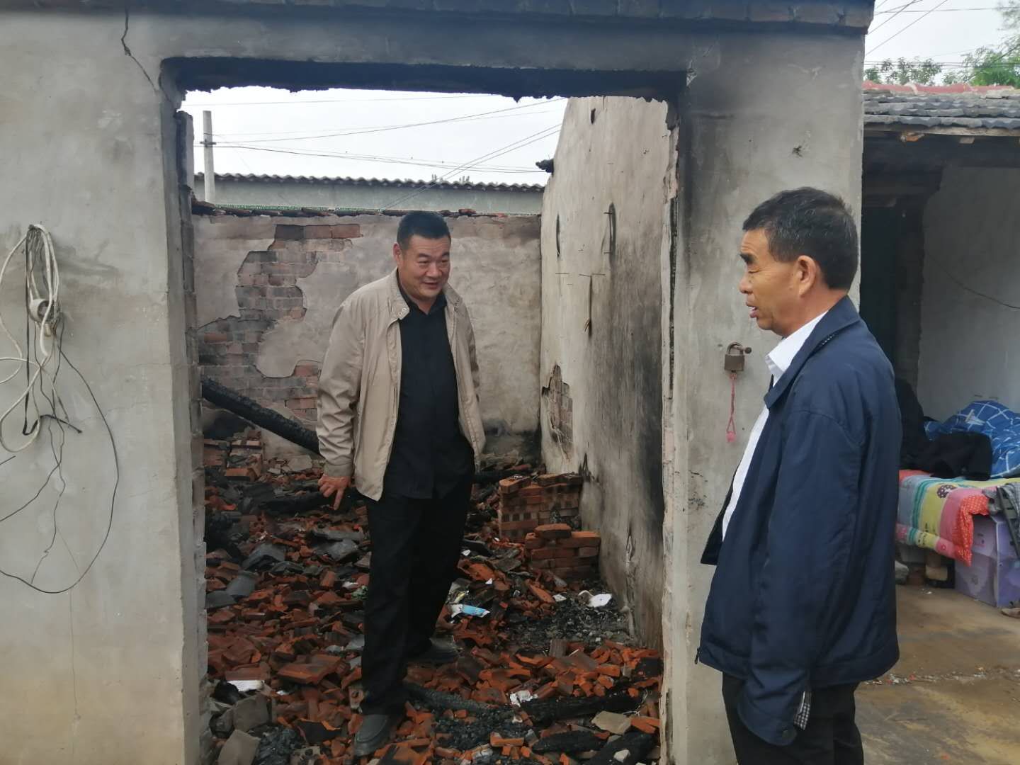 聽完情況后,督導(dǎo)組立刻和駐村工作人員一起到李洪范家查看情況,現(xiàn)場(chǎng)主屋已經(jīng)全部燒毀,屋里到處是瓦礫......李洪范站在被燒毀的房屋里,表情木納的自言自語(yǔ)道“燒得一干二凈,什么都沒(méi)了,這以后咋弄呀。”現(xiàn)場(chǎng)詢問(wèn)其生活情況時(shí),李洪范說(shuō),“當(dāng)天,鄉(xiāng)里邊就送來(lái)了米、油和錢。村長(zhǎng)也送來(lái)了幾件衣服,現(xiàn)在就是沒(méi)有地方住?!?/p>